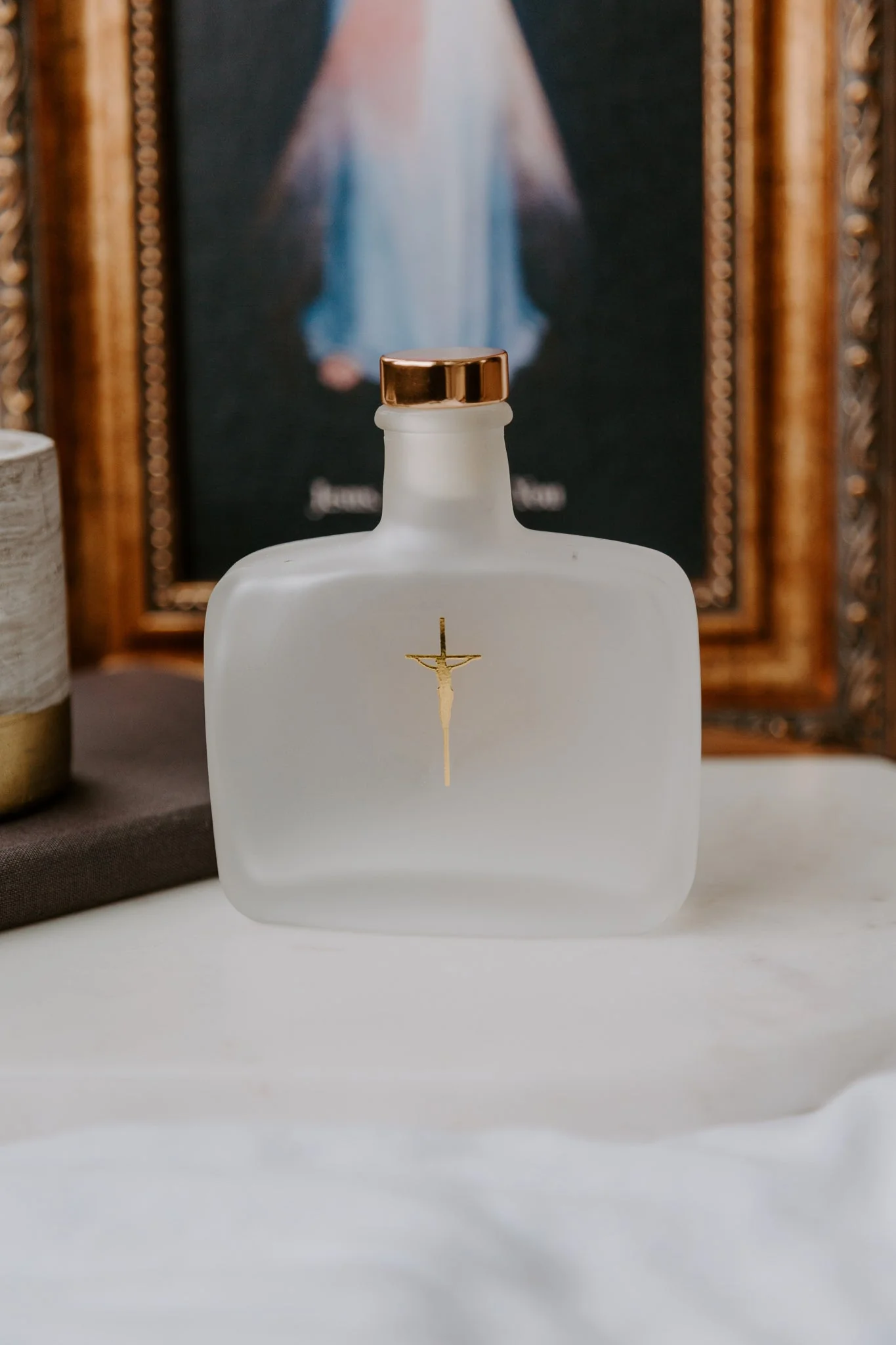 A beautiful new take on a Catholic household essential. Bless yourself, your family, and your home daily with this frosted glass Holy Water bottle.