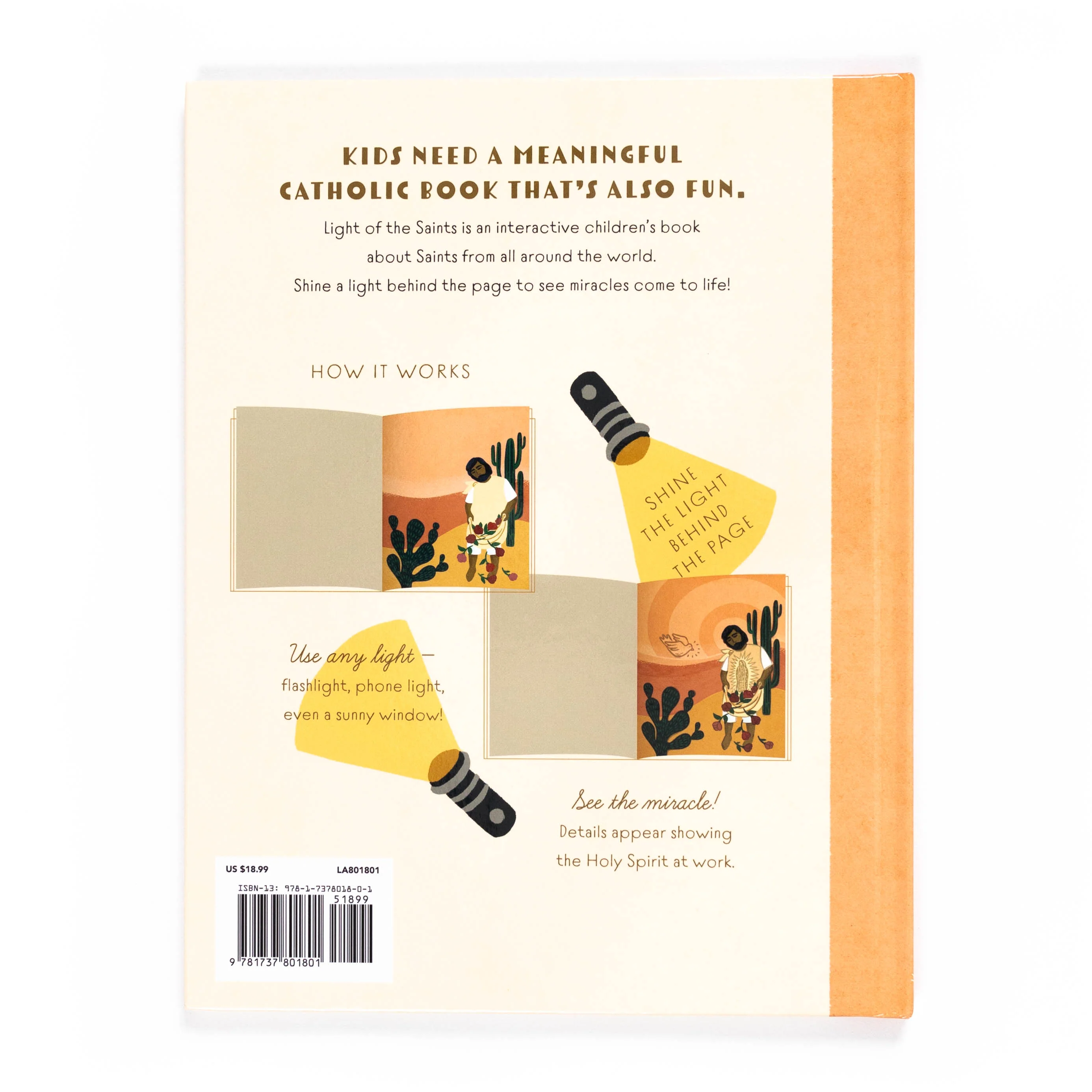 Kids need a meaningful Catholic book that's also fun. Light of the Saints is an interactive, light-based children's book that tells the story of 12 saints from around the world. Shine a light behind the page to see hidden images of their miracles and heroic acts. Light of the Saints is the answered prayer for parents who want to teach their kids about the saints. AND it rhymes! All you need in addition to the book is a flashlight or phone light.